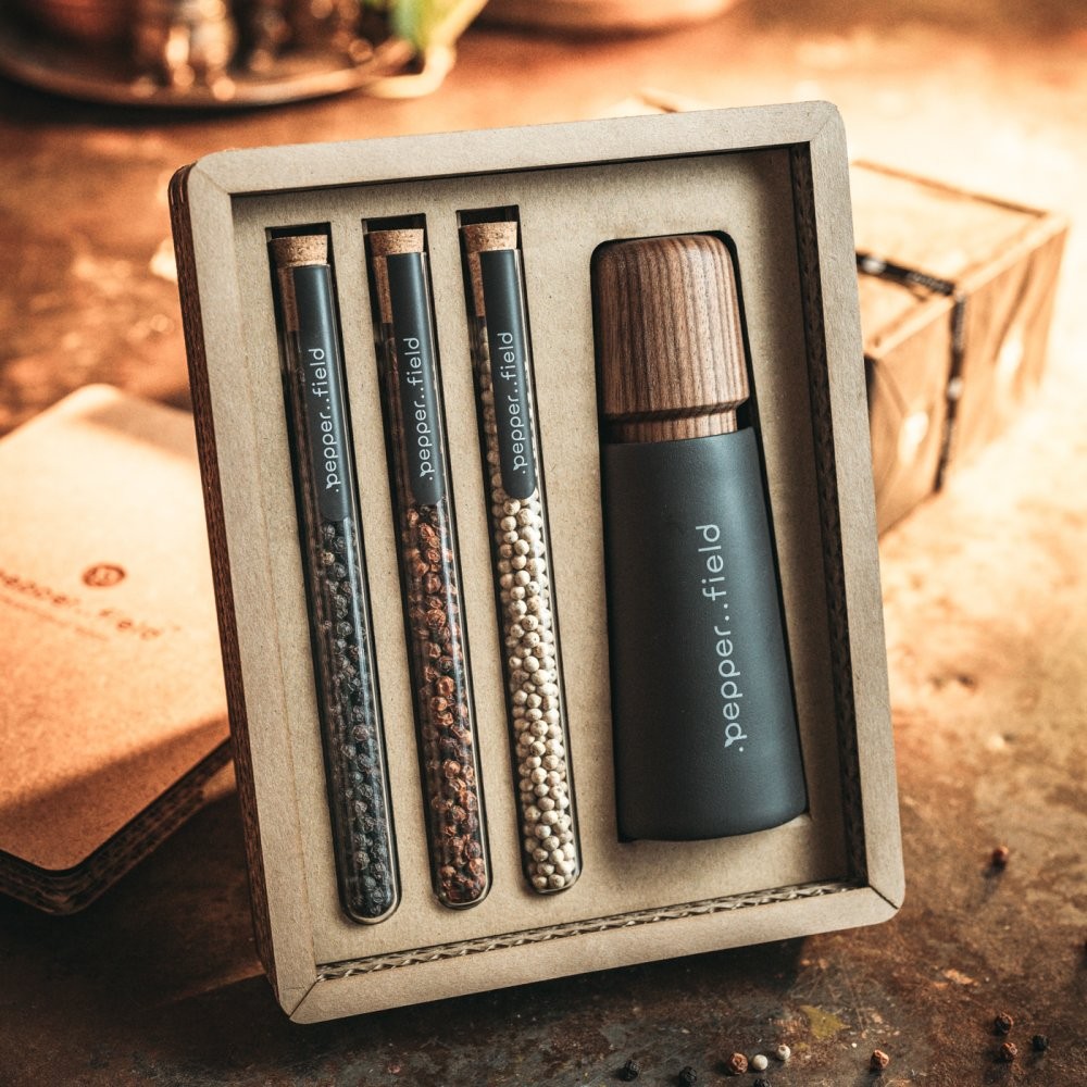 Toto dárkové balení obsahuje 3 zkumavky z čirého a českého skla, kdy v první zkumavce je pepř černý, v druhé pepř červený a v třetí pepř bílý, pepř je vždy po 12 gramech. Tato sada je tedy perfektní pro ty, kdo chtějí okusit to nejlepší, co Kampotský pepř nabízí. Každá kulička pepře v tomto balení je pečlivě vybírána a čištěna s nejvyšší mírou kvality. Zkumavky jsou navíc vloženy do designové kartonové krabičky. Nezalekněte se slova karton, krabička je opravdu kvalitní a nezalekne se ani trošky vody, kvalitní zpracování. V krabičce pak najdete i kvalitní, 17 cm vysoký mlýnek, který vlastní i patentovaný mlecí mechanismus CeraCut®, a je navíc ve skandinávském provedení, prostě skvost.