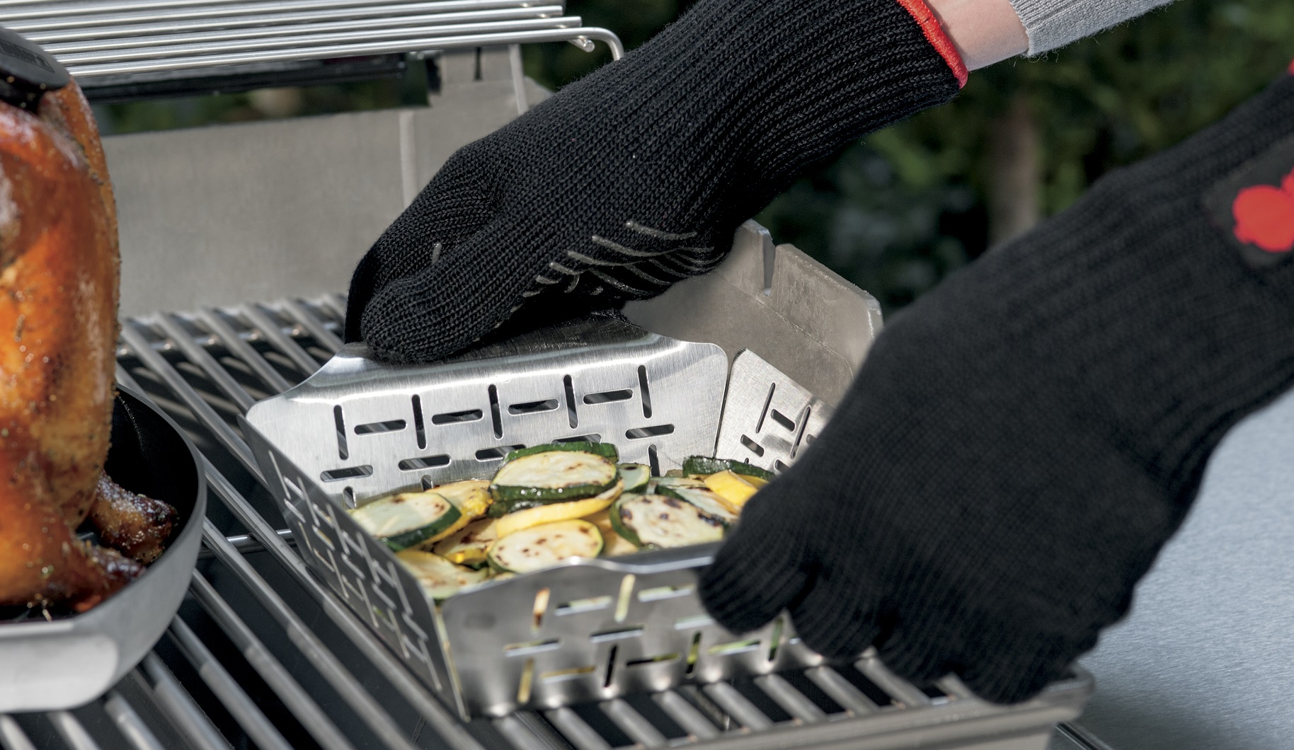 Nie je tomu inak ani v prípade grilovacieho košíka Weber Deluxe. Je vyrobený z nerezovej ocele a po grilovaní ho môžete jednoducho vložiť do umývačky riadu. Po stranách koša sa nachádzajú dve rukoväte na jednoduchú manipuláciu s príslušenstvom. V porovnaní s inými košmi je tento košík výrazne hlbší, takže je ideálny napríklad na prípravu pečených zemiakov. Rovnako ako rôzne kombinácie zeleniny, ani zemiaky sa v koši nerozvaria, pretože ich môžete jednoducho premiešať bez toho, aby vypadli z koša.