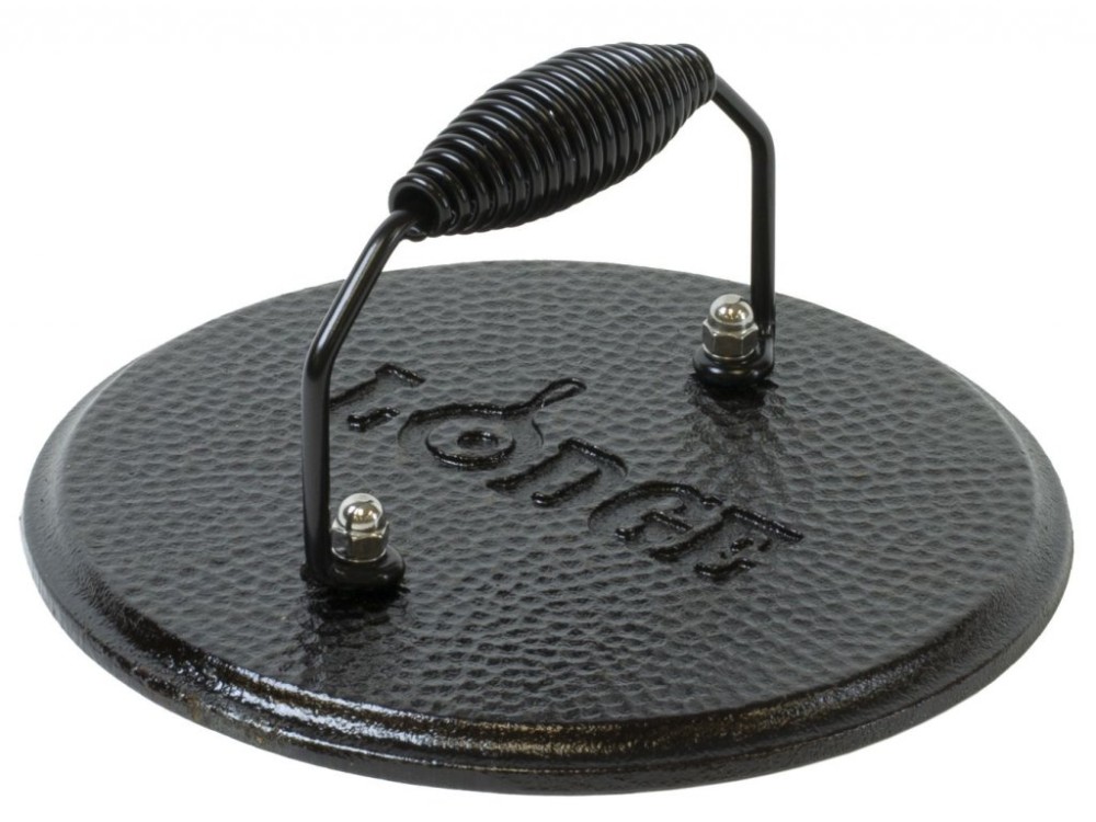 Litinová žehlička Lodge slouží ke spolehlivému zatížení masa, slaniny, zeleniny či třeba hub, když je restujete na litinové pánvi nebo třeba na plancha grilu. Žehlička je z robustní litiny a připravované jídlo dostatečně zatíží, díky čemuž se potraviny budou celým povrchem dotýkat žáru pod ní.