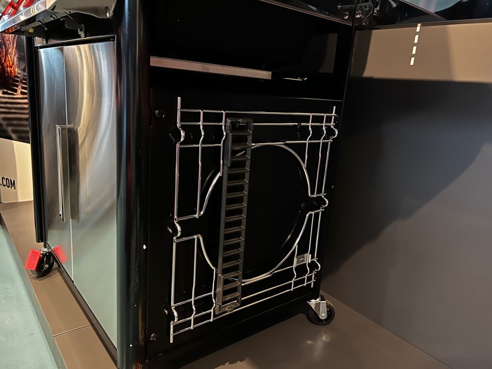 Tato řada Genesis nenechává v pozadí ani vnitřní prostory grilu. Nově uzpůsobené skladování plynové láhve nadchne hlavně ty, kteří ji nemají rádi na očích. Do vnitřní skříňky se na levou stranu vejde i ta největší, 11 kg ocelová láhev a vše je tak uloženo útulně uvnitř grilu. My doporučujeme používat 10 kg kompozitní láhve, jsou o dost lehčí a manipulace je tak snadnější. Dále je pod levou poličkou grilu přídavný úložný prostor, kam můžeme uschovávat například nové Weber Crafted příslušenství, otáčecí špíz, nebo jakékoliv grilovací nádobí. Bonus je i malá polička na koření ve dvířkách této přídavné skříňky. Pod pravou poličkou grilu jsou pak umístěny háčky pro Weber Crafted rám, nebo litinový rošt, podle toho, co zrovna nepoužíváme. Díky novým úložným prostorům tak budete mít vždy vše při ruce.