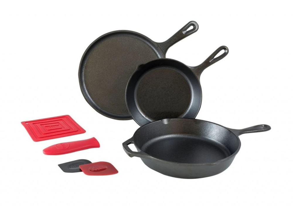 Výhodná sada litinových pánví Lodge obsahující litinovou pánev 20 cm, litinovou pánev 26 cm, litinovou pánev na palačinky a příslušenství. Celý popis produktu