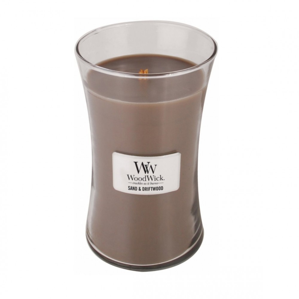 WoodWick velké sklo - Sand & Driftwood je vůně písku a naplaveného dřeva. Dokonalá souhra sluncem vyšisovaného dřeva, mořské trávy a jemného bílého písku.